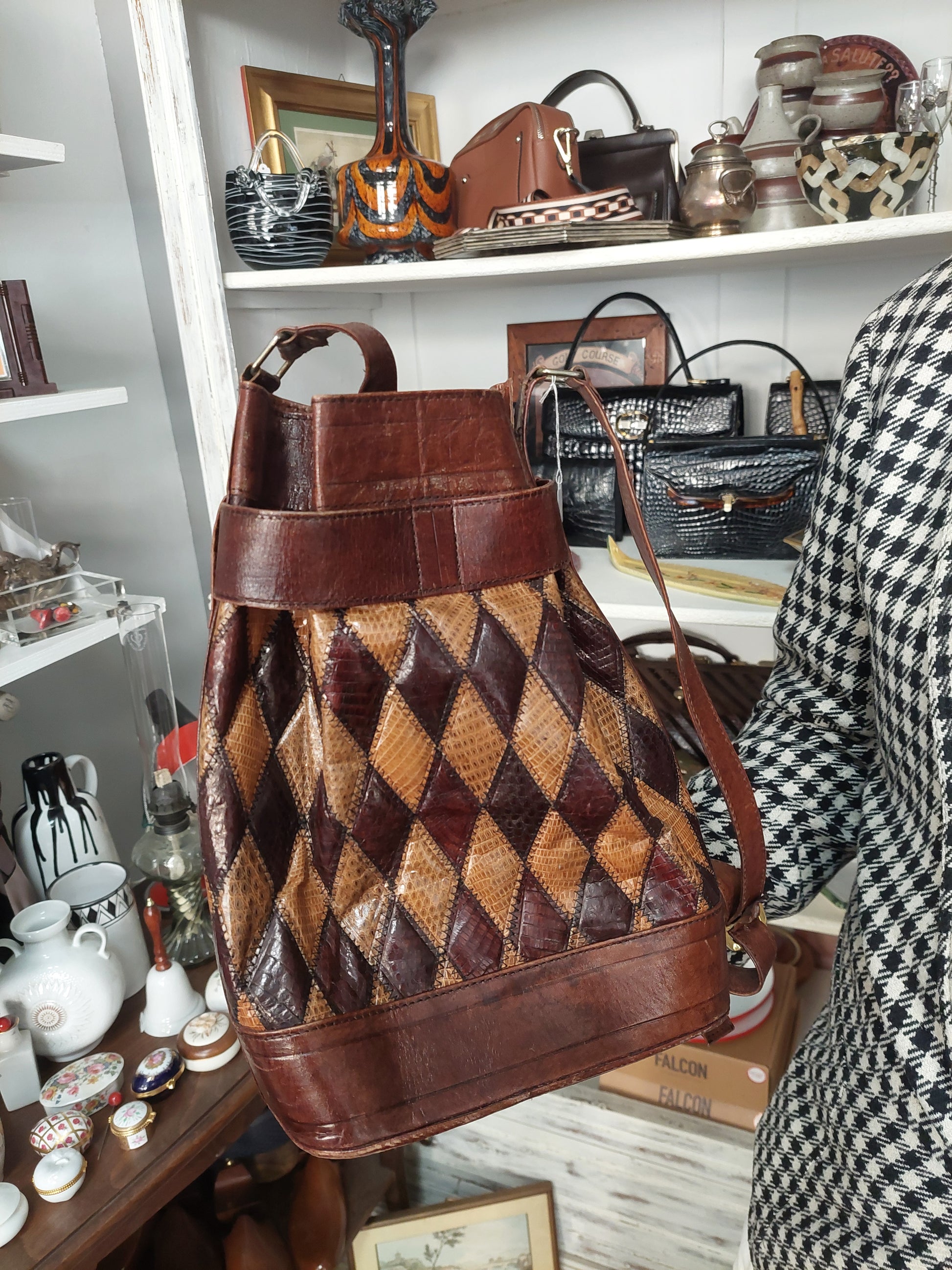 Borsa a forma di secchiello, in cuoio con inserti in rettile, a tracolla; formato medio, fibbie in ottone. Presenta una chiusura a poussoir sul davanti.