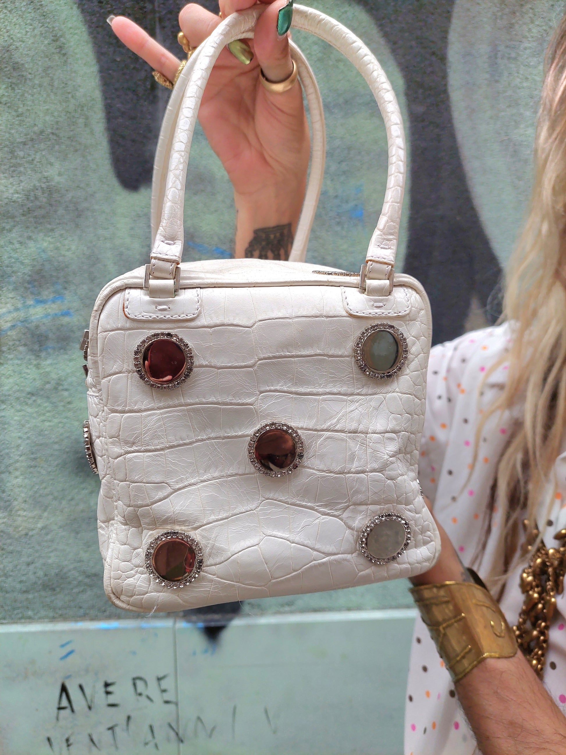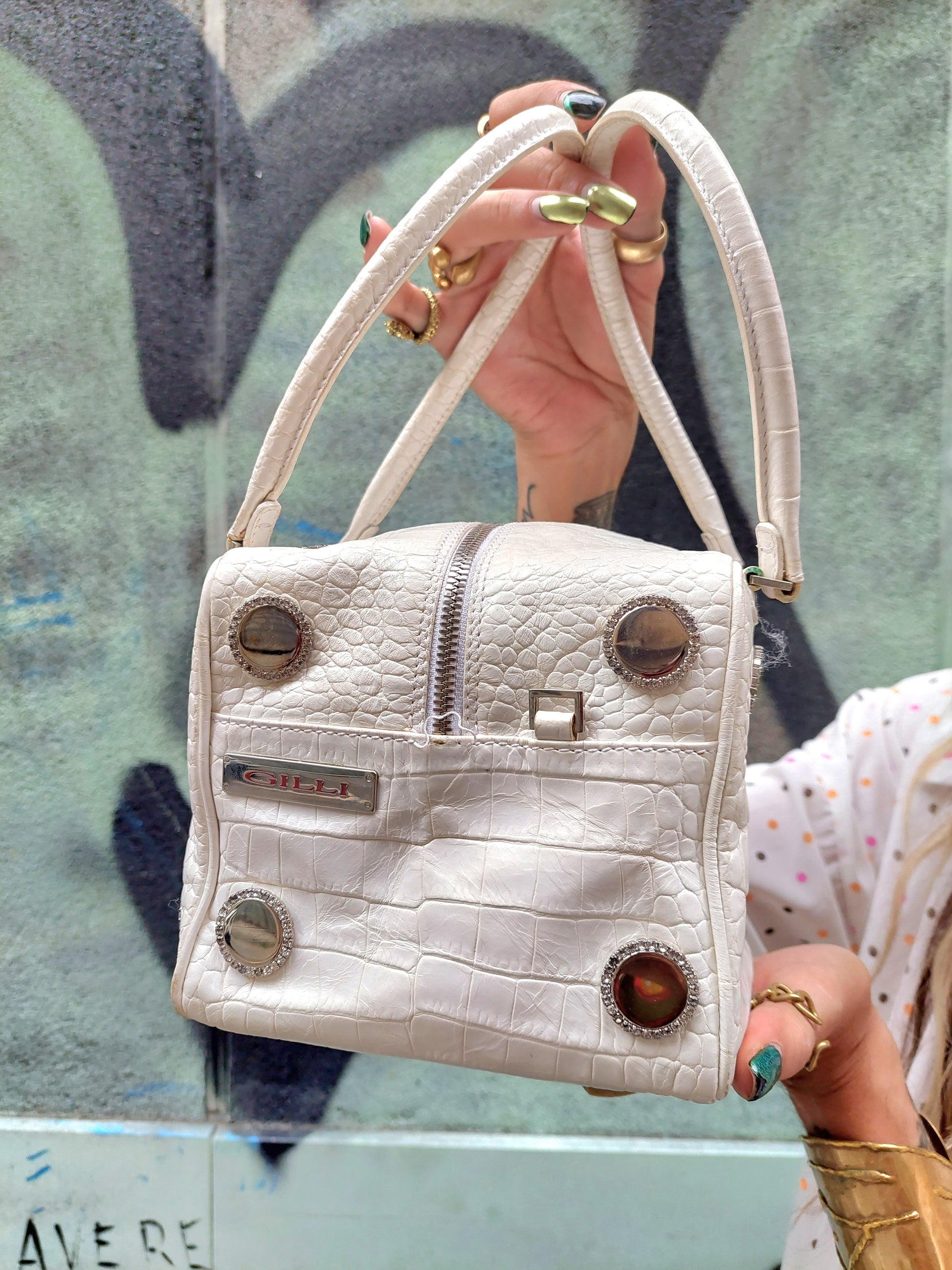 Borsetta in pelle bianca, a forma di dado, firmata Gilli; sono presenti i numeri in metallo argentato e strass, su tutti i lati.