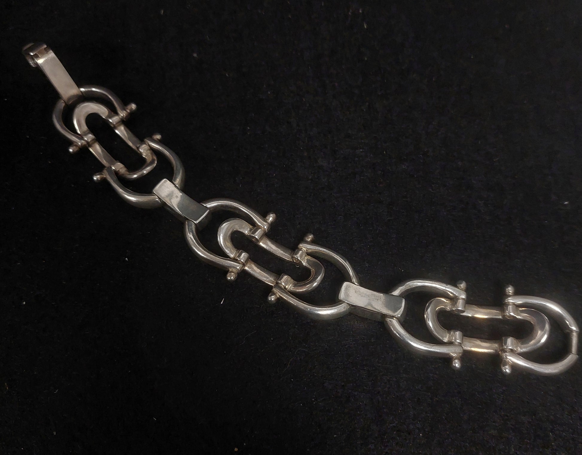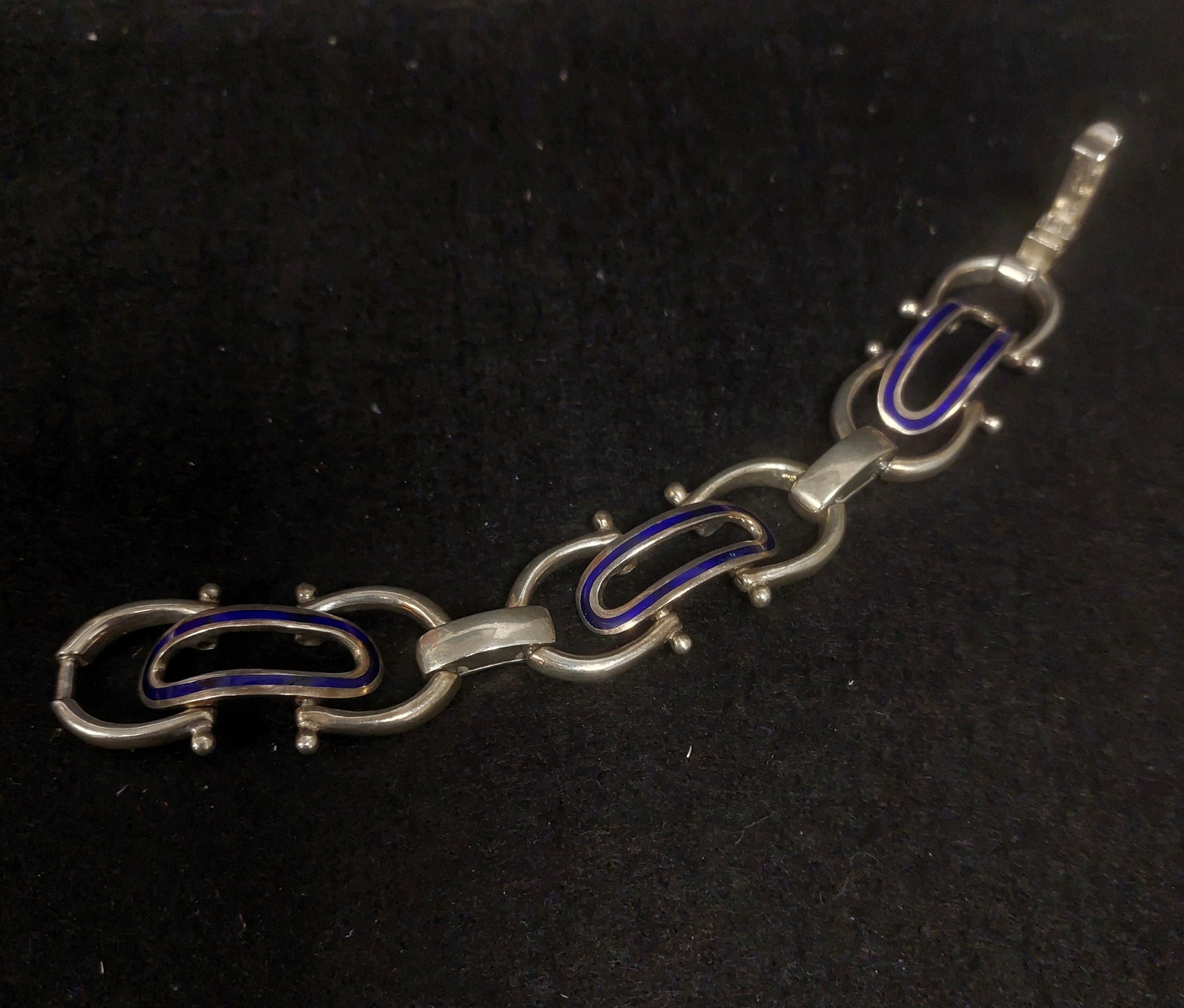 Bracciale in argento anni '70, arricchito con smalto di colore blu; la chiusura è a coccodrillo.