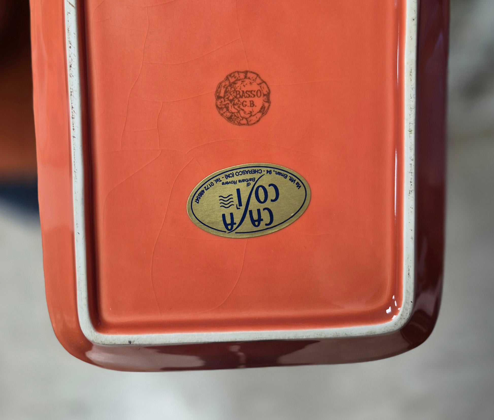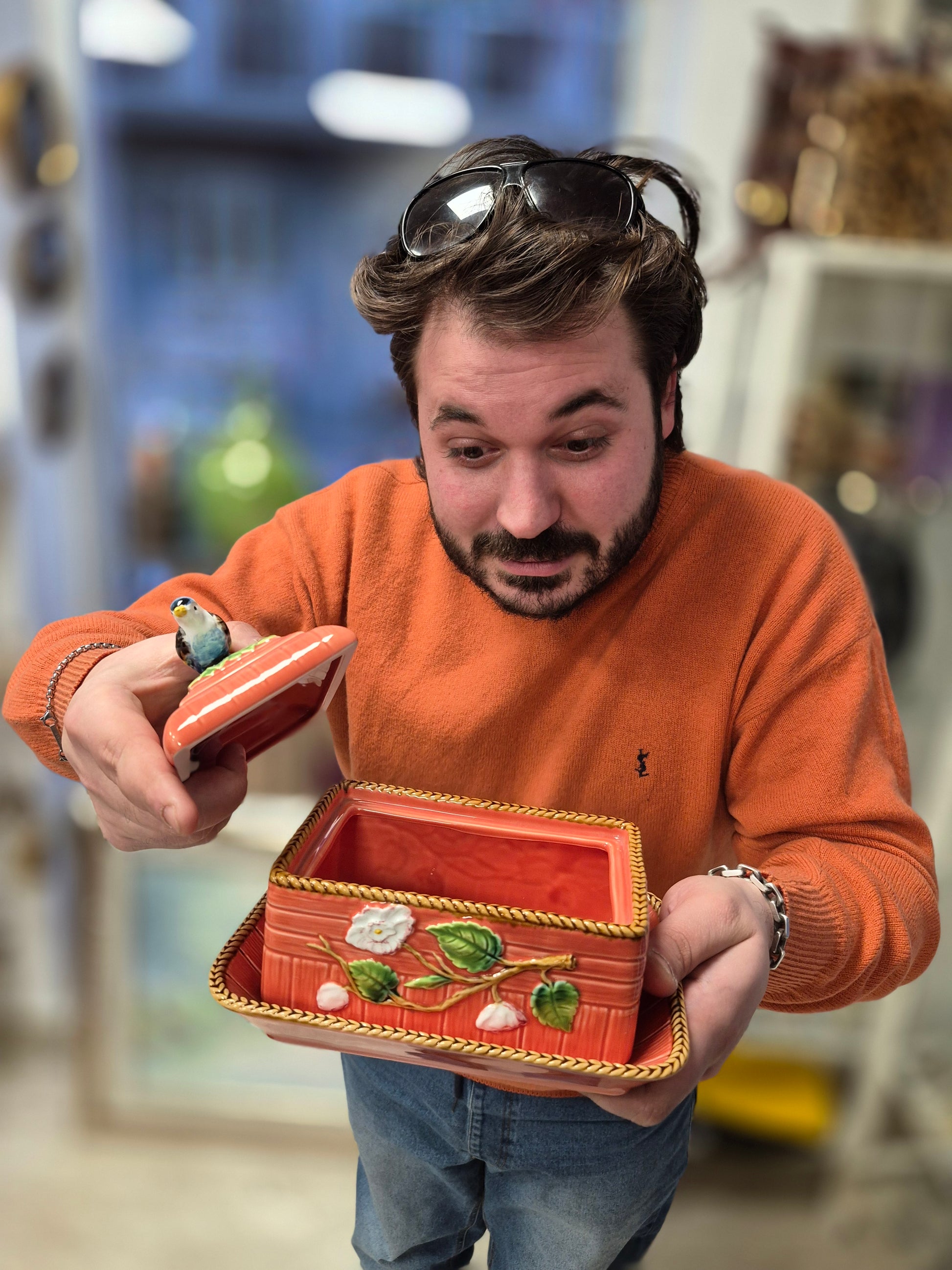 Burriera in ceramica con vassoietto portapanetto, color arancione con un grazioso uccellino sul coperchio. Ceramica prodotta da Basso G.B.
