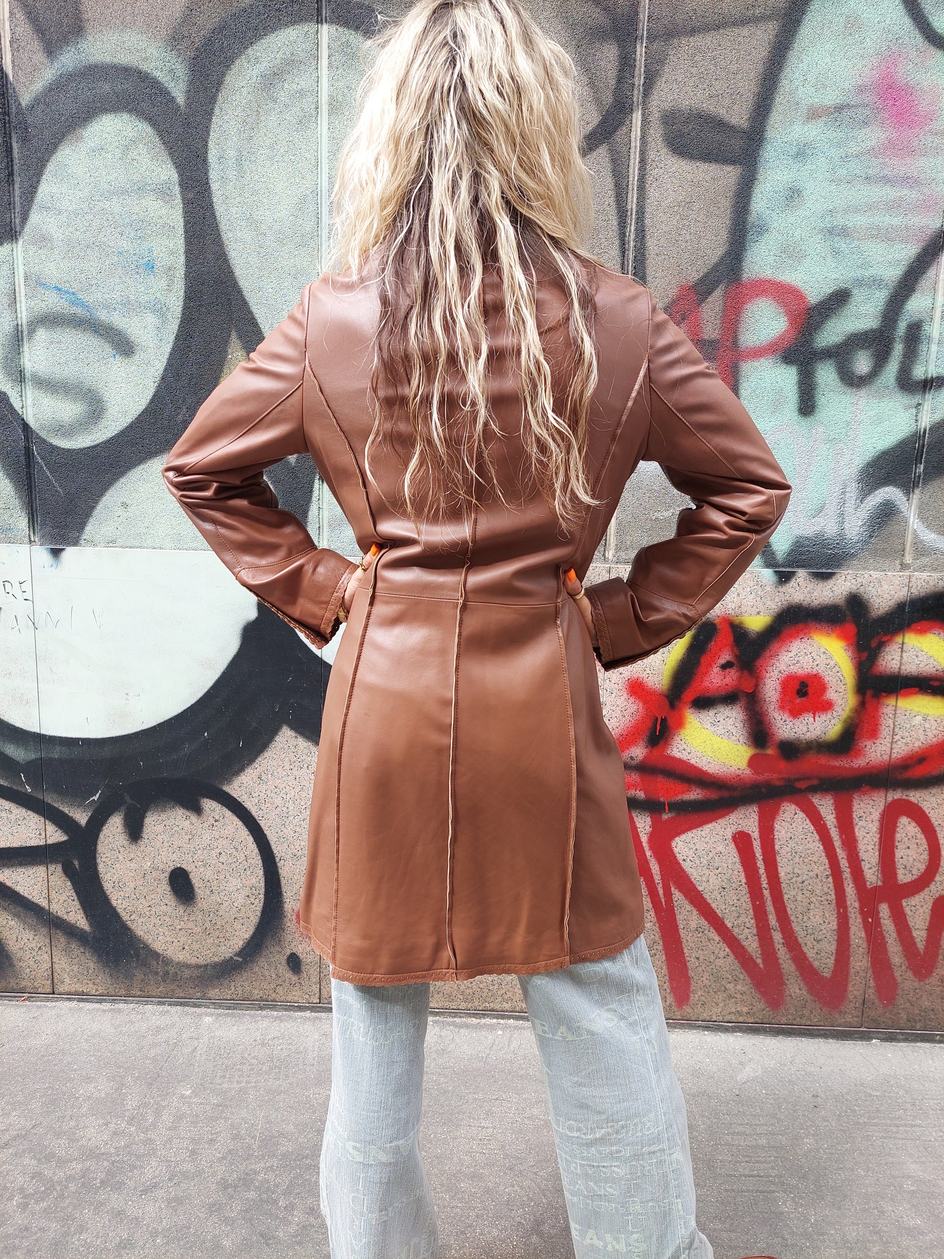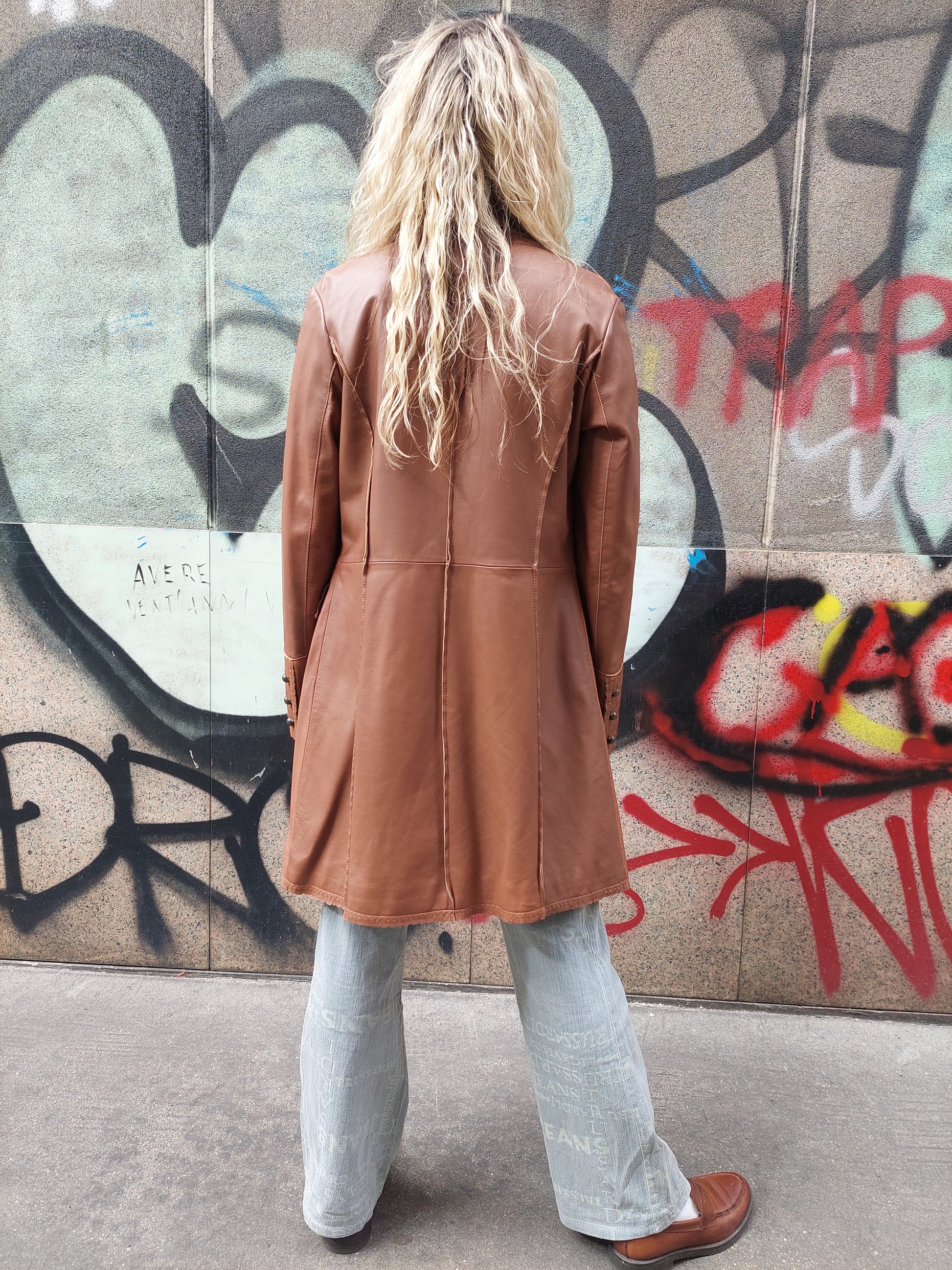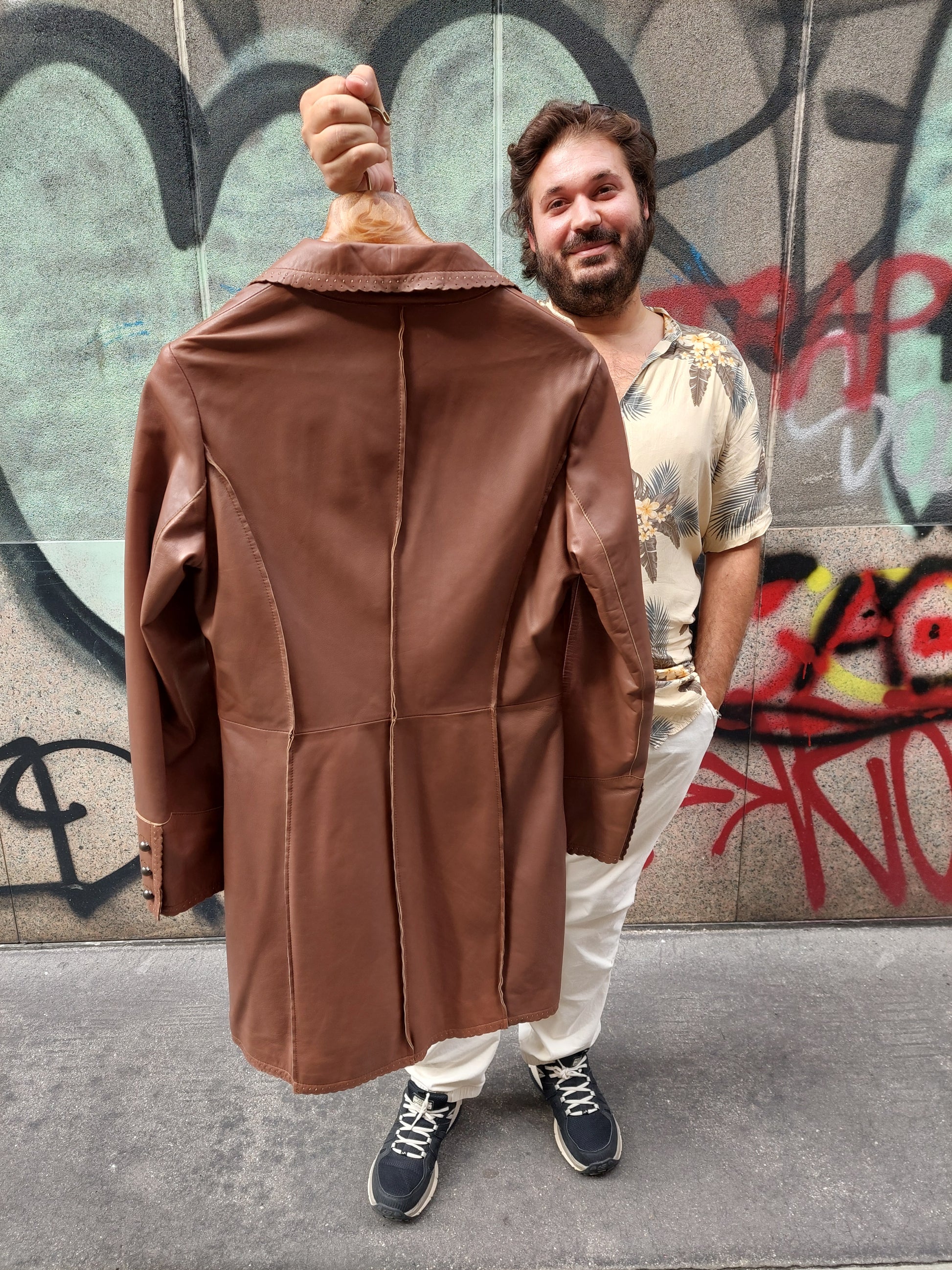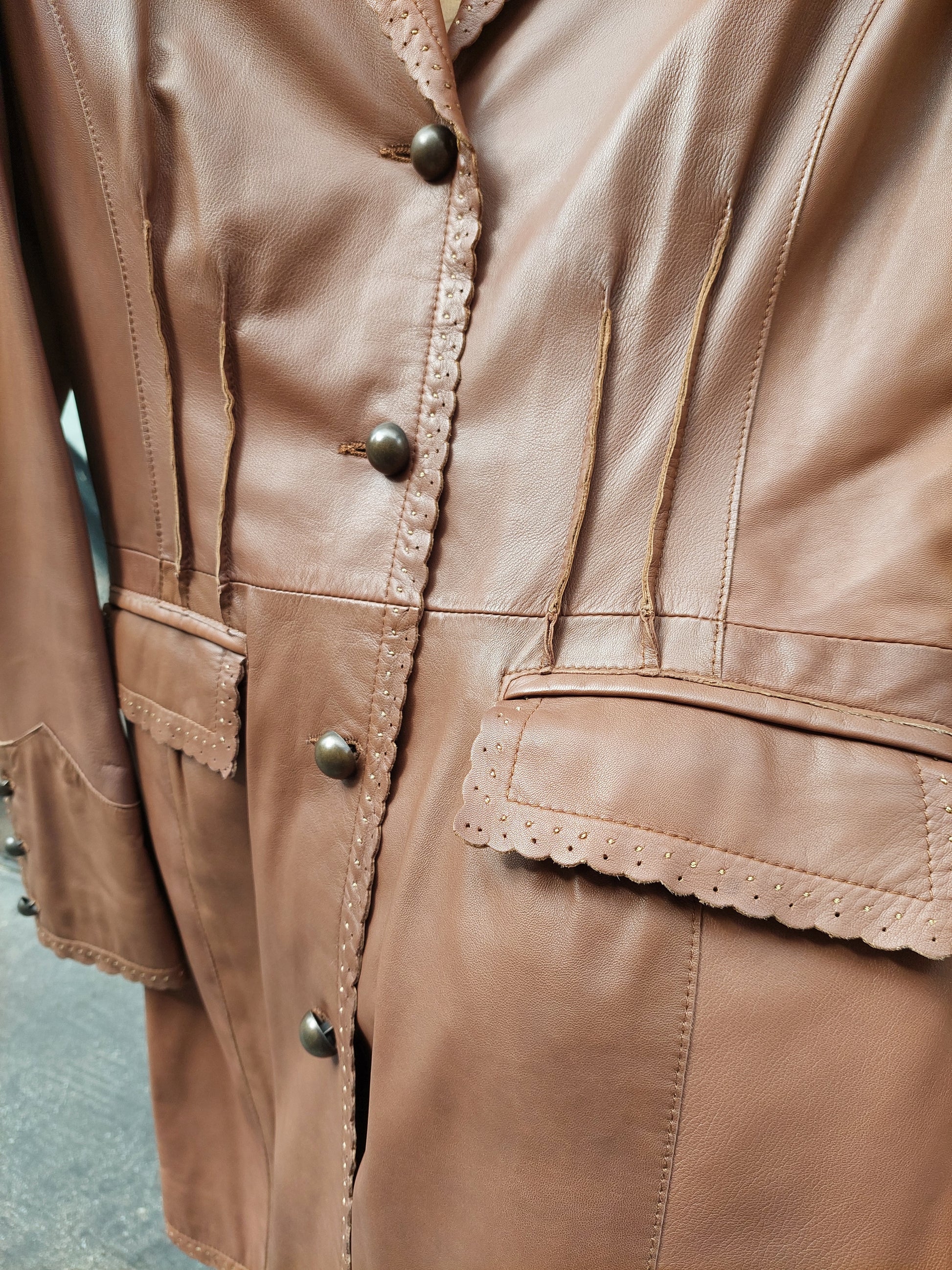 Cappottino in nappa color caramello, con bottoni in bronzo; maniche e tasche son taglio a merletto. Presenta due grandi tasche sul davanti. La nappa è morbidissima, di alta qualità.