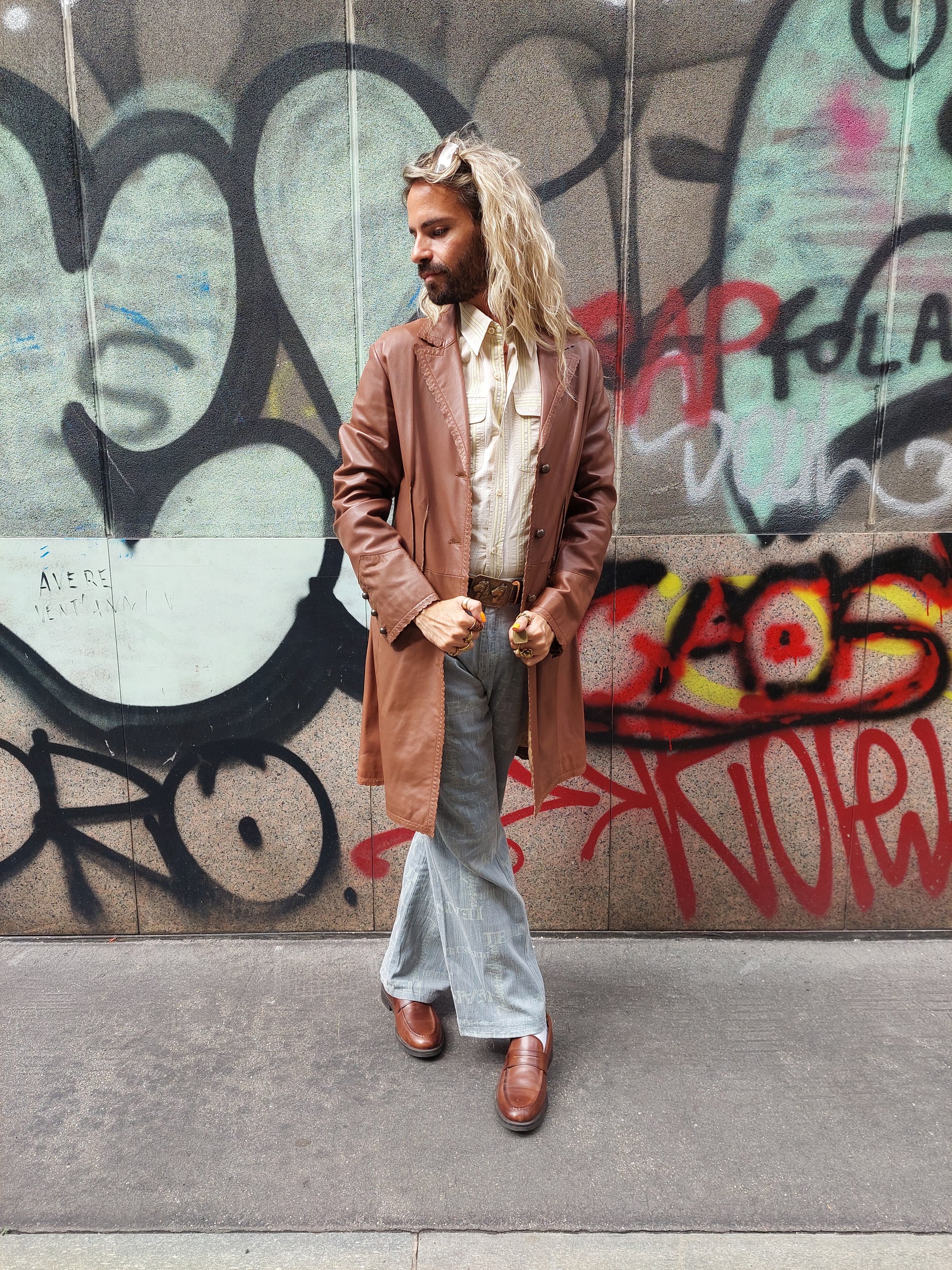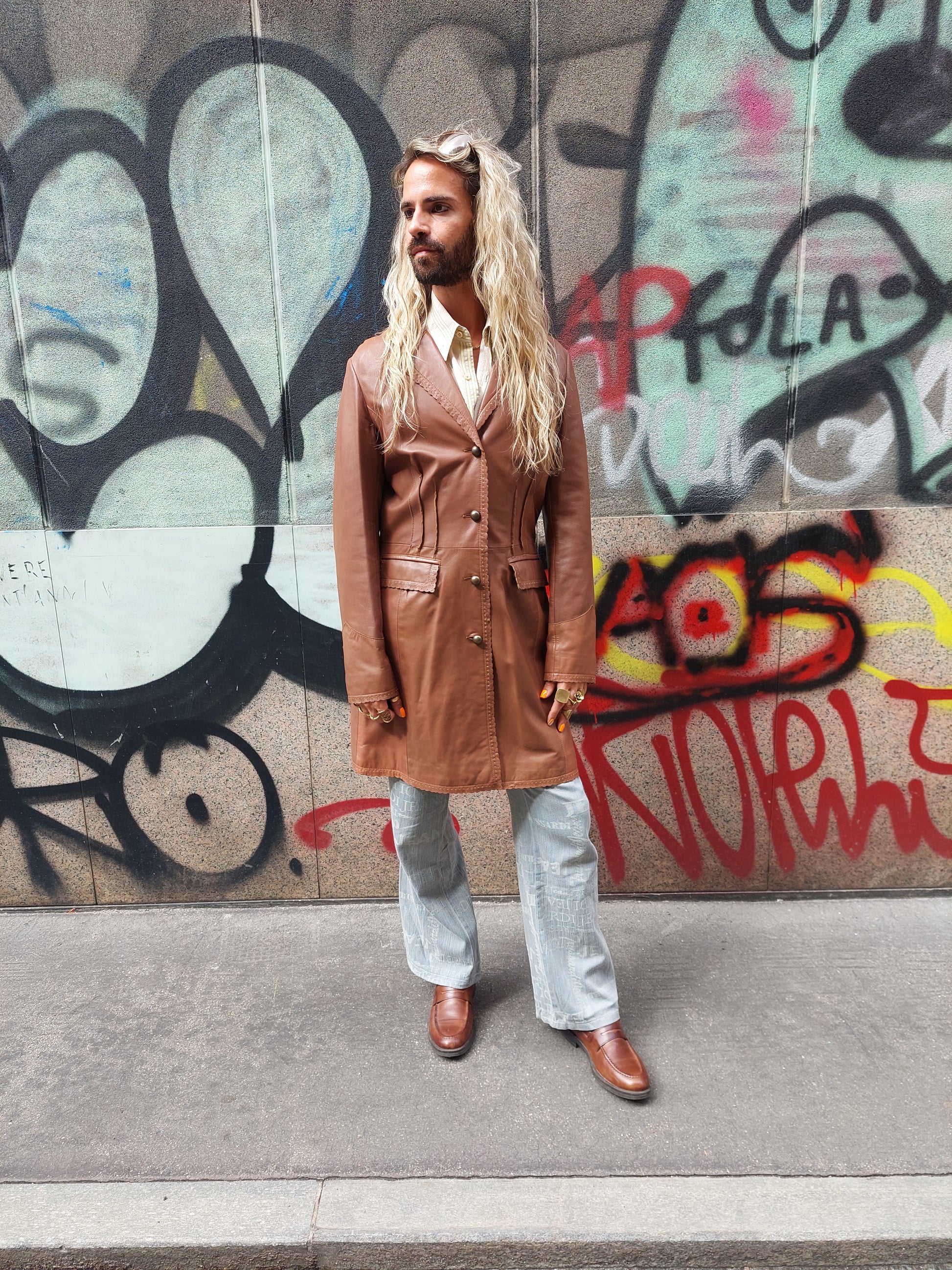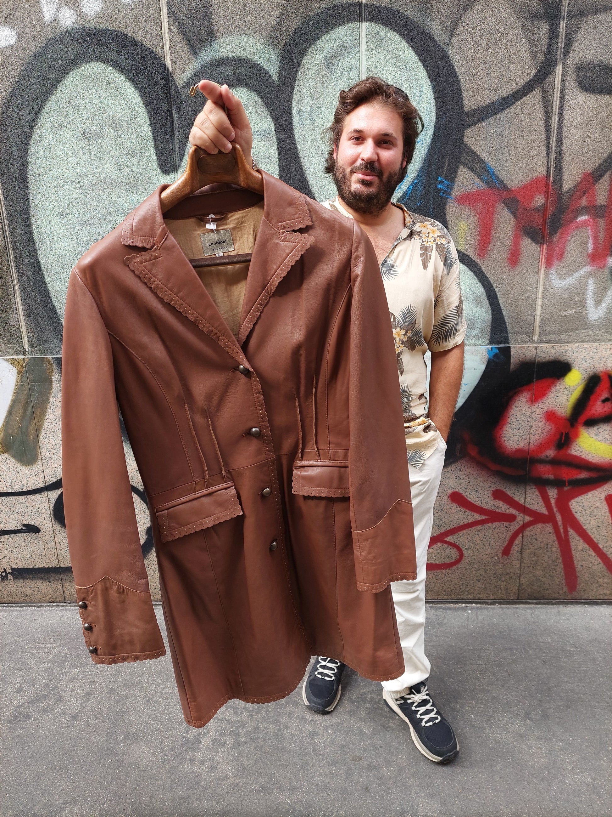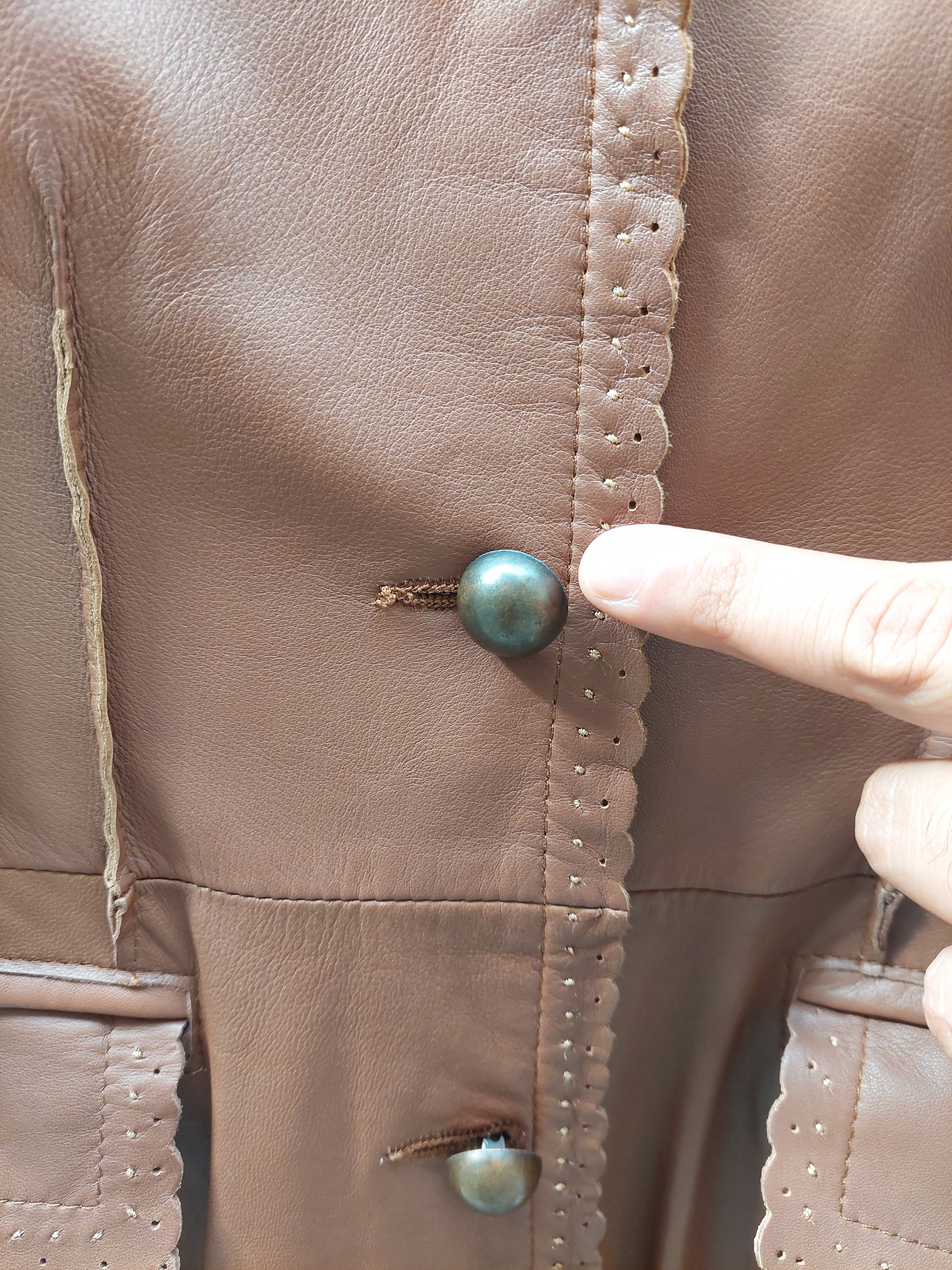 Cappottino in nappa color caramello, con bottoni in bronzo; maniche e tasche son taglio a merletto. Presenta due grandi tasche sul davanti. La nappa è morbidissima, di alta qualità.