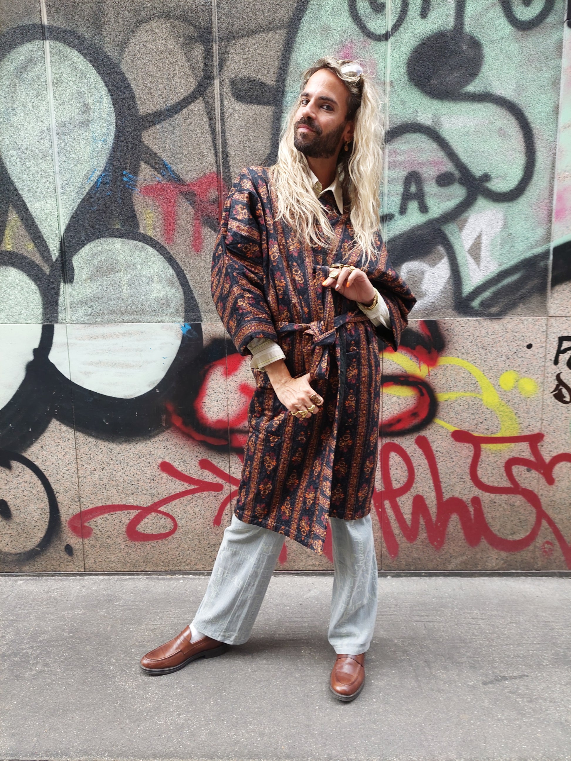 Cappotto con motivo floreale su sfondo nero; chiusura senza bottoni ma con cintura dallo stesso motivo. Presenta due taschine sulla parte frontale.