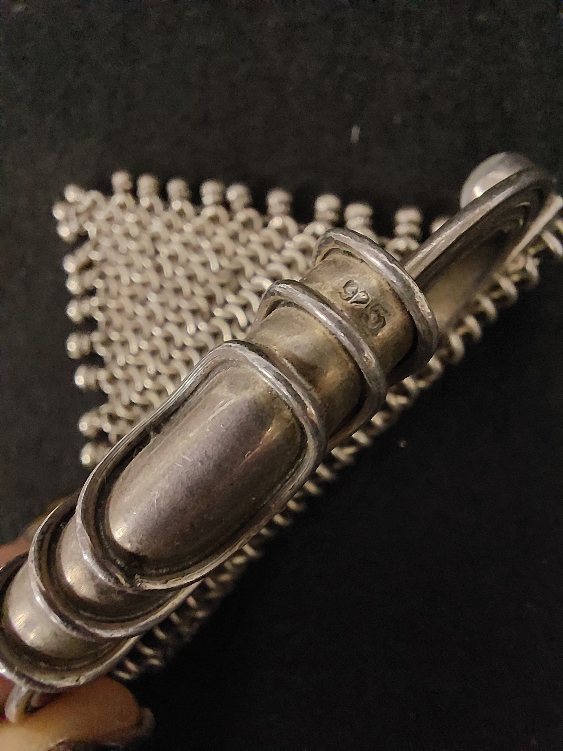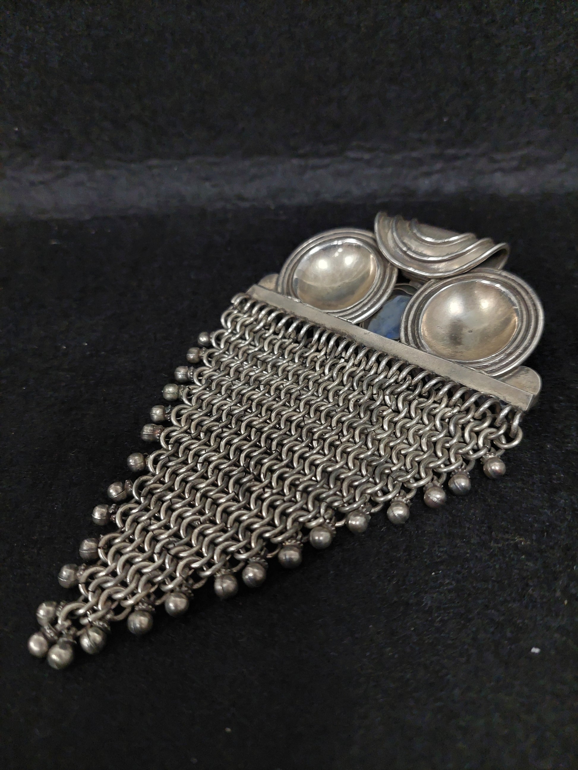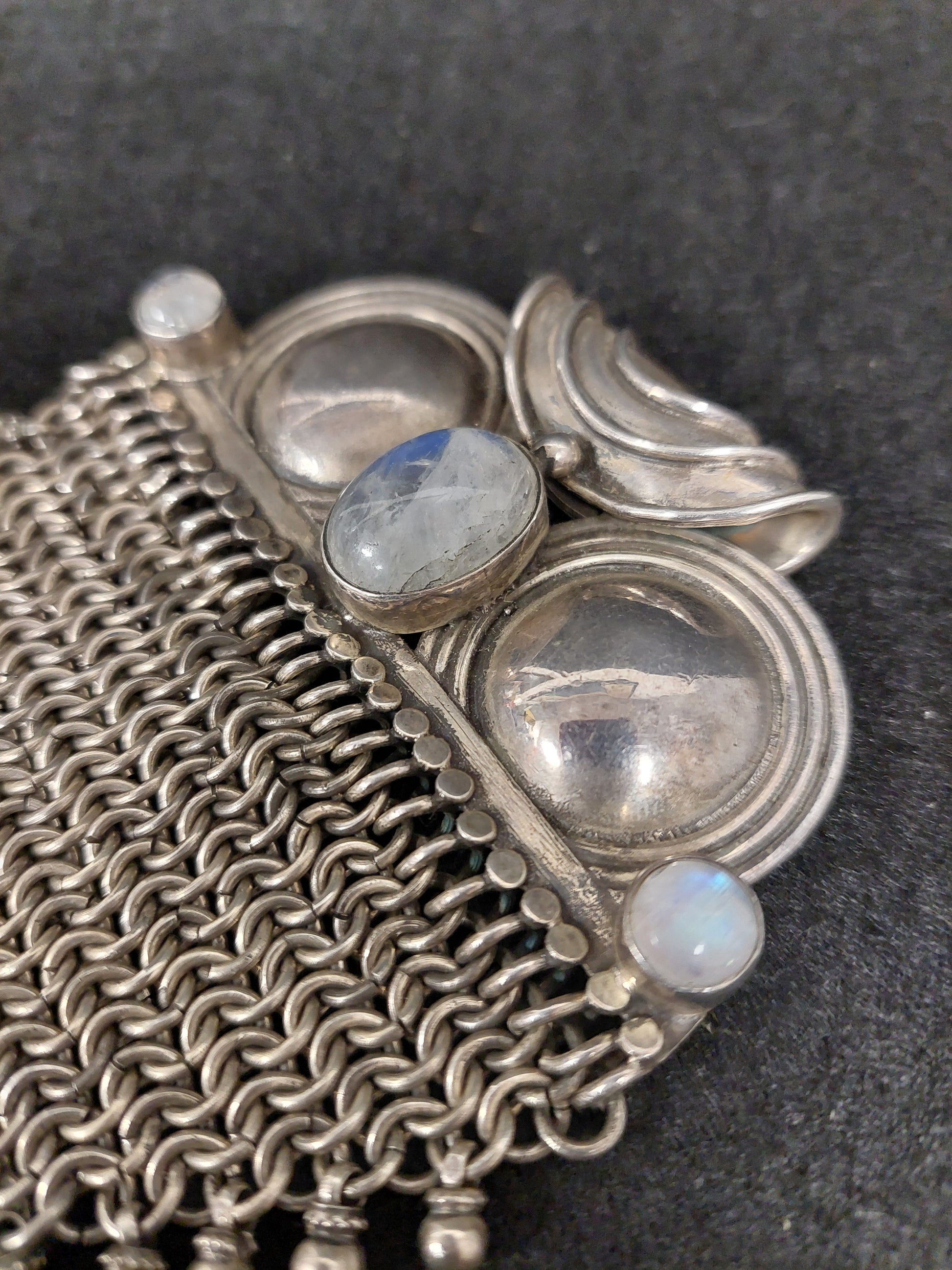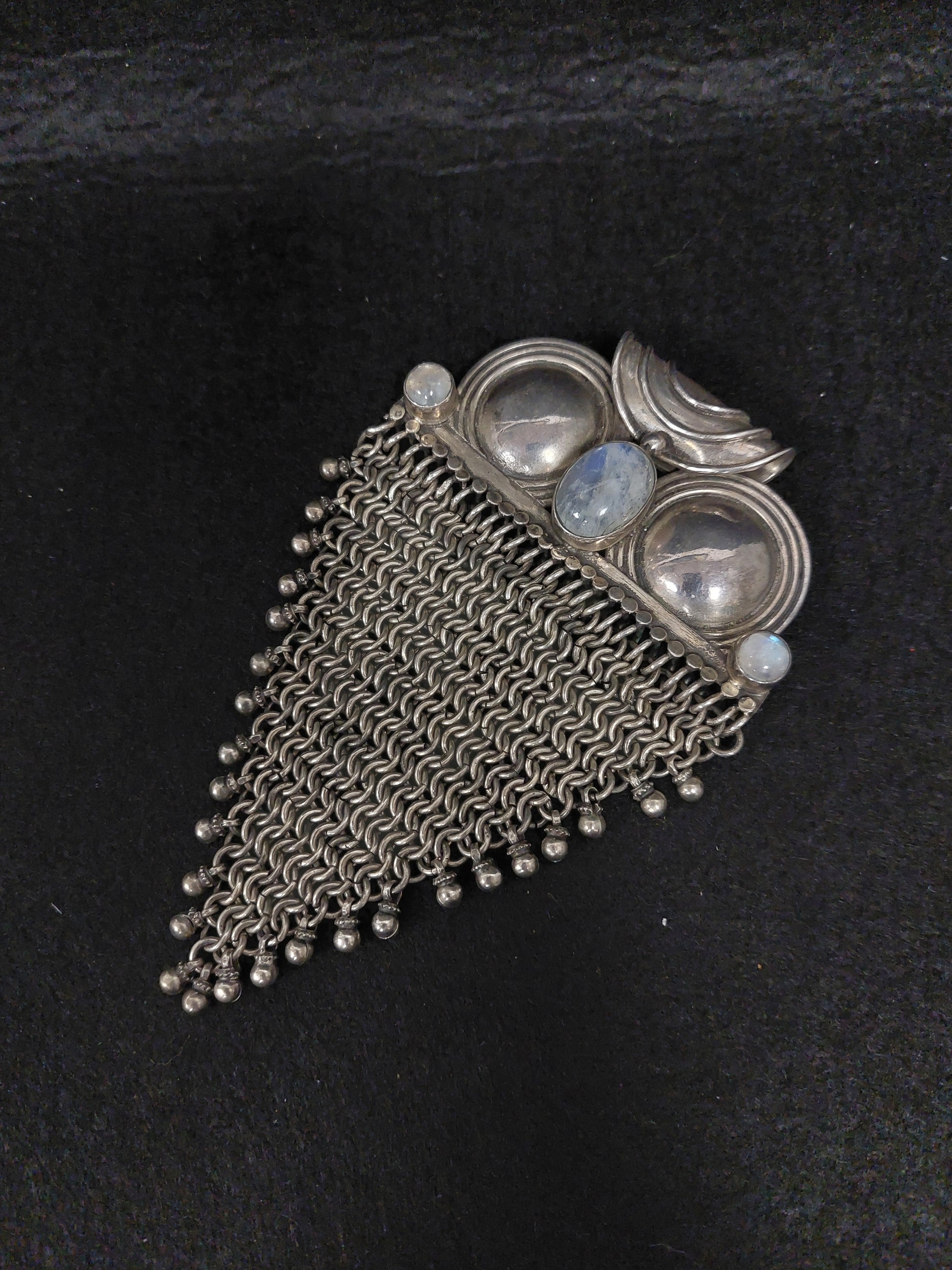 Grande ciondolo in argento 925 e tre labradoriti a taglio cabochon, ricordante come forma un gufo. Il ciondolo è costruito con delle piastre in argento liscie; nella parte inferiore troviamo una lavorazione a maglia tessita. Peso: 107 gr.