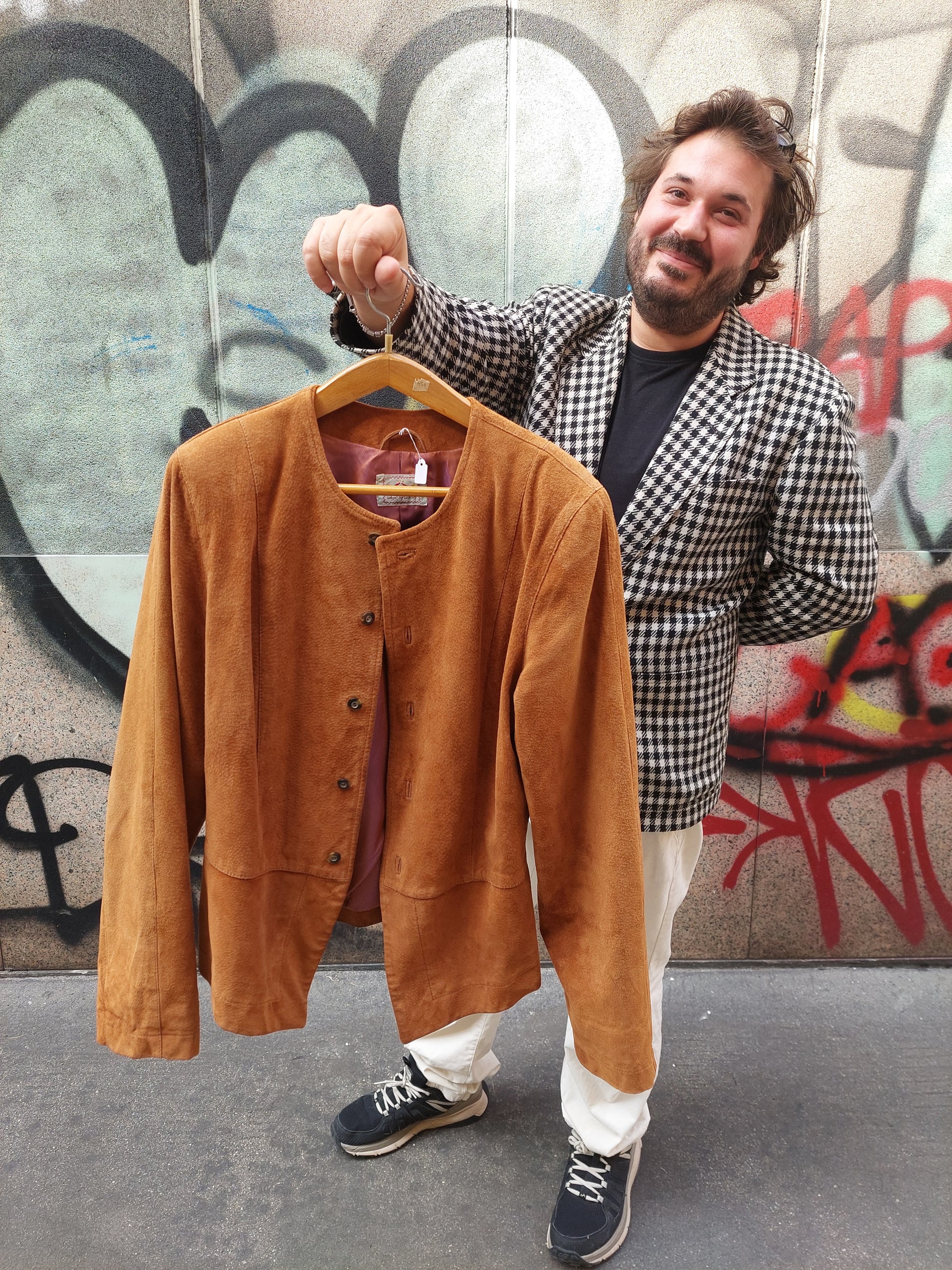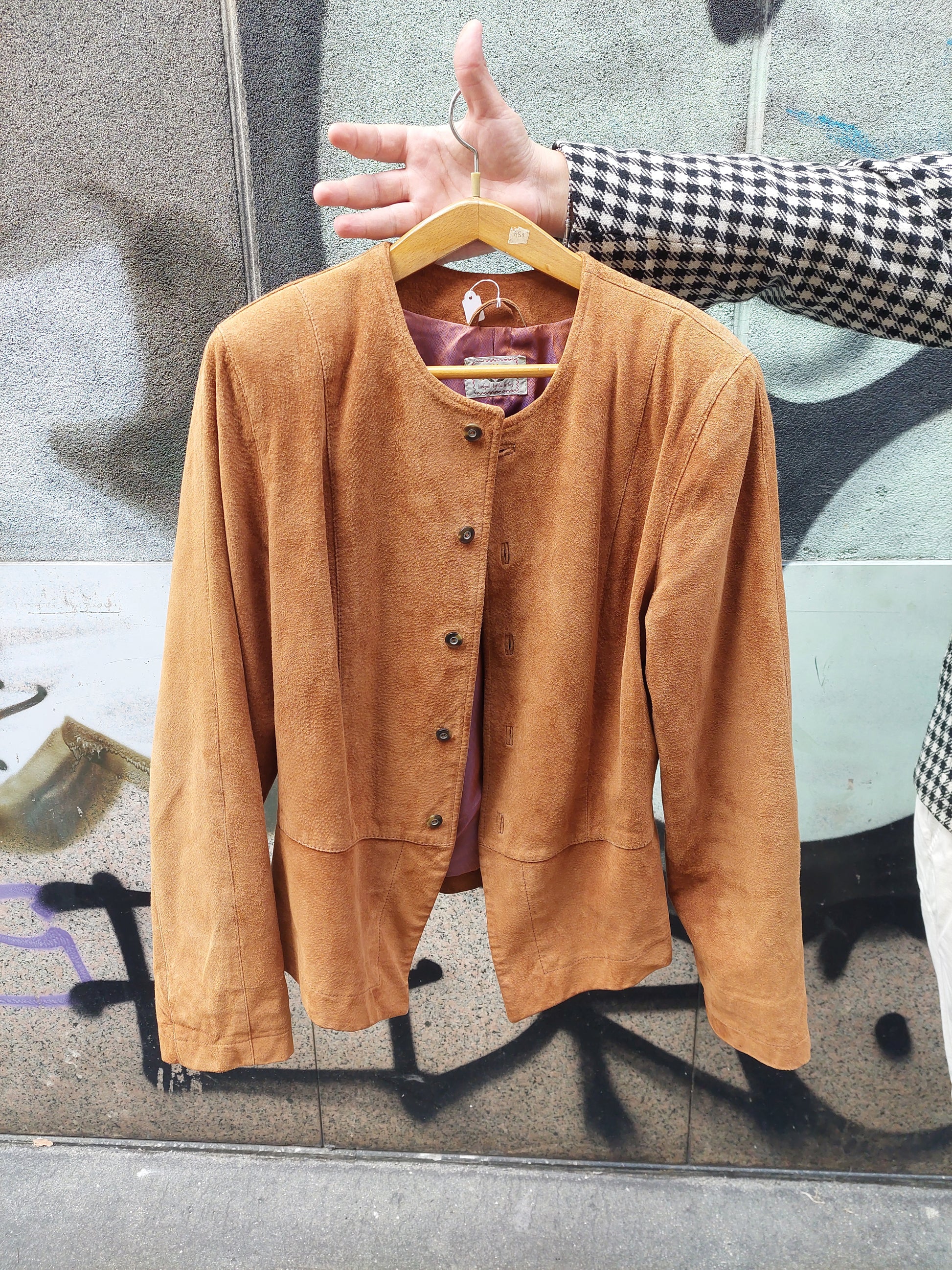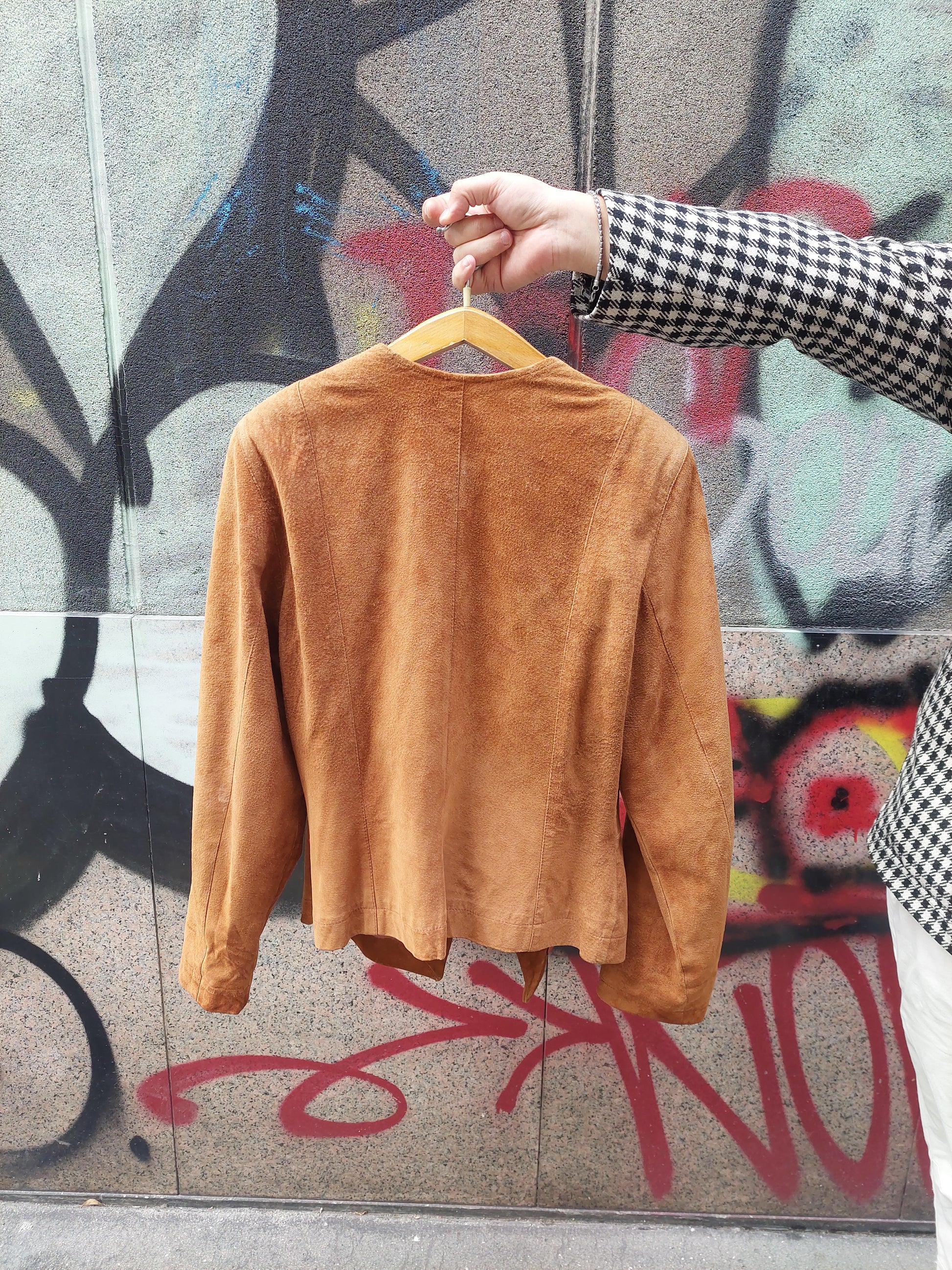 Giacchino in renna, con bottoni; la fodera all' interno è color viola cangiante.