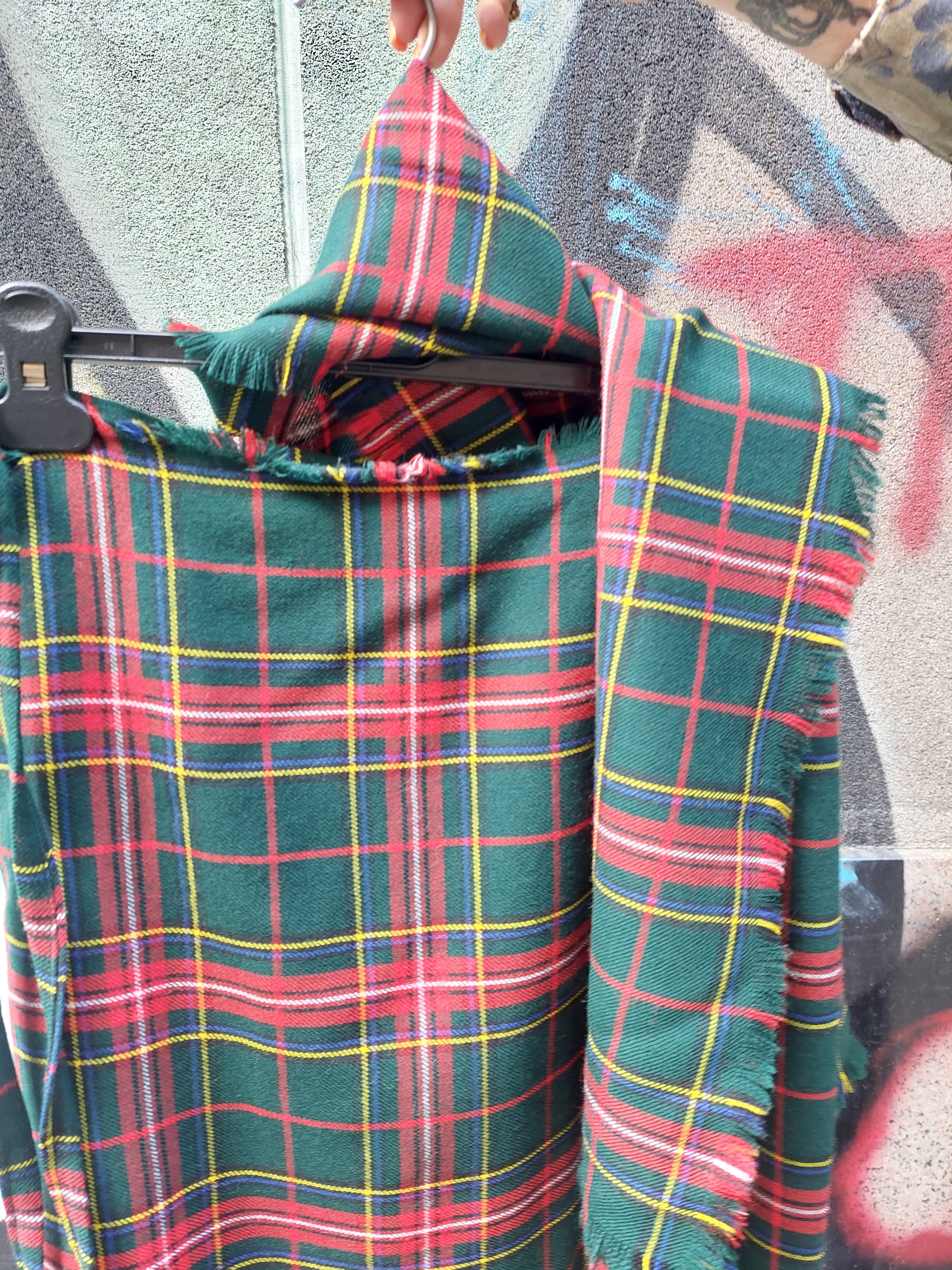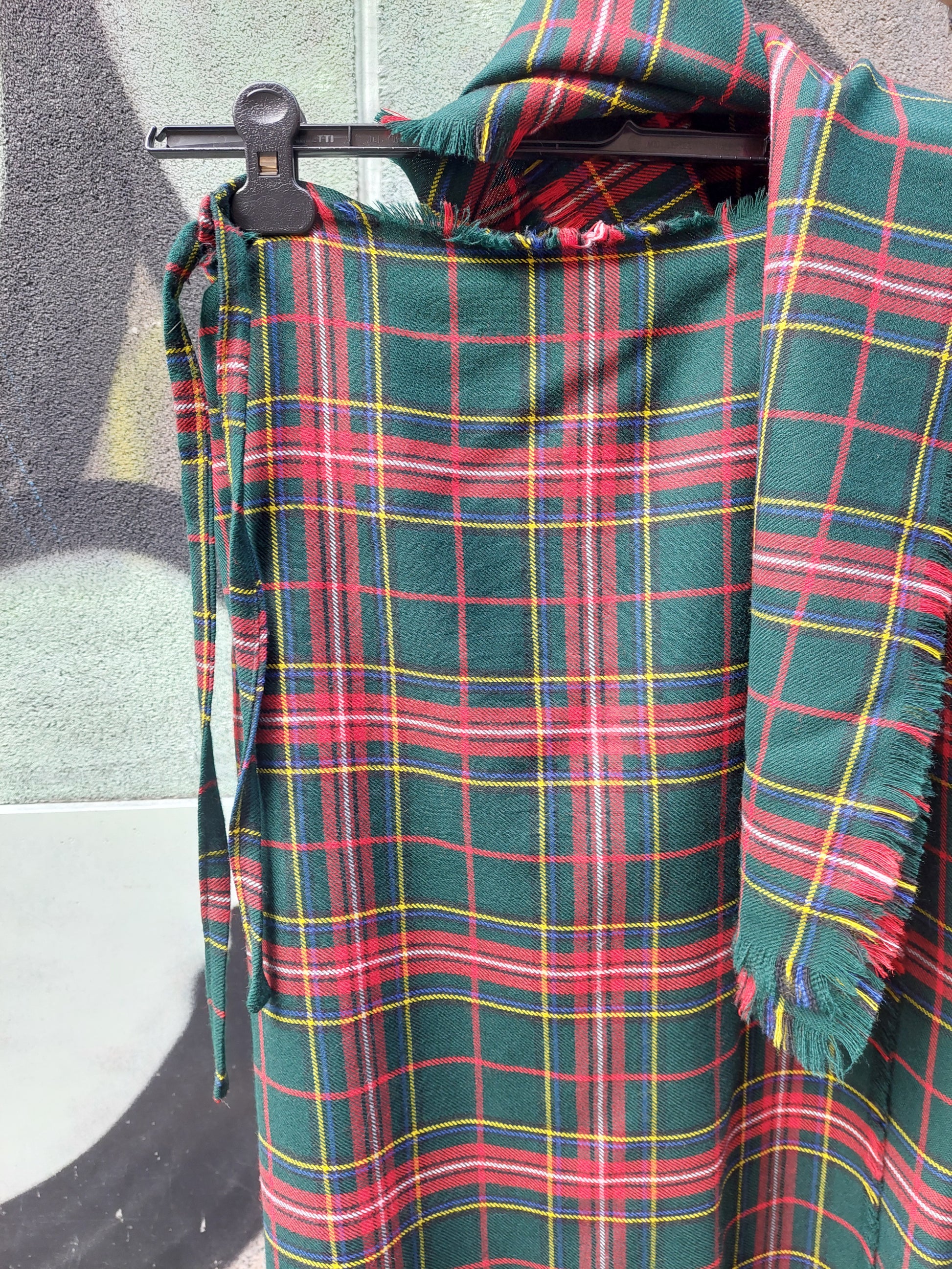 Kilt scozzese, 100% lana, il cui colore di base è il verde; abbinata è presente anche una sciarpina dello stesso colore.