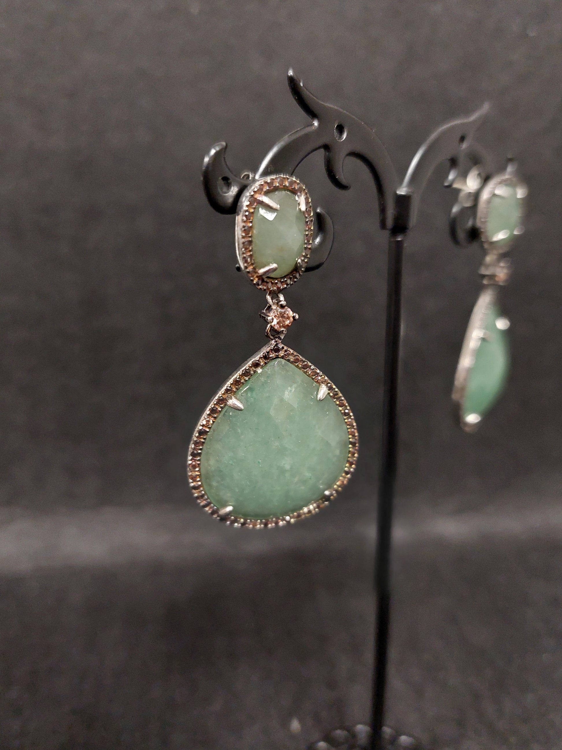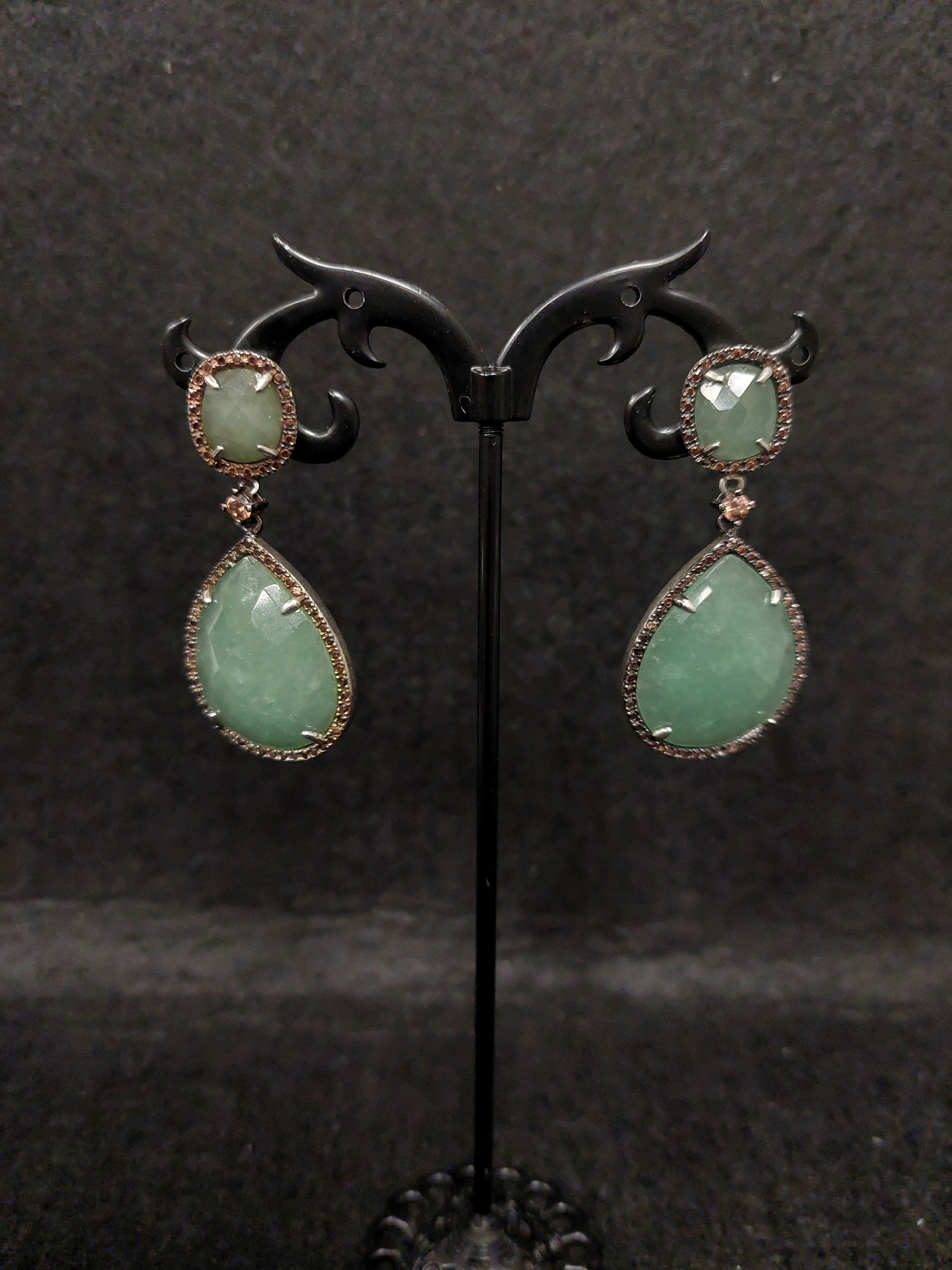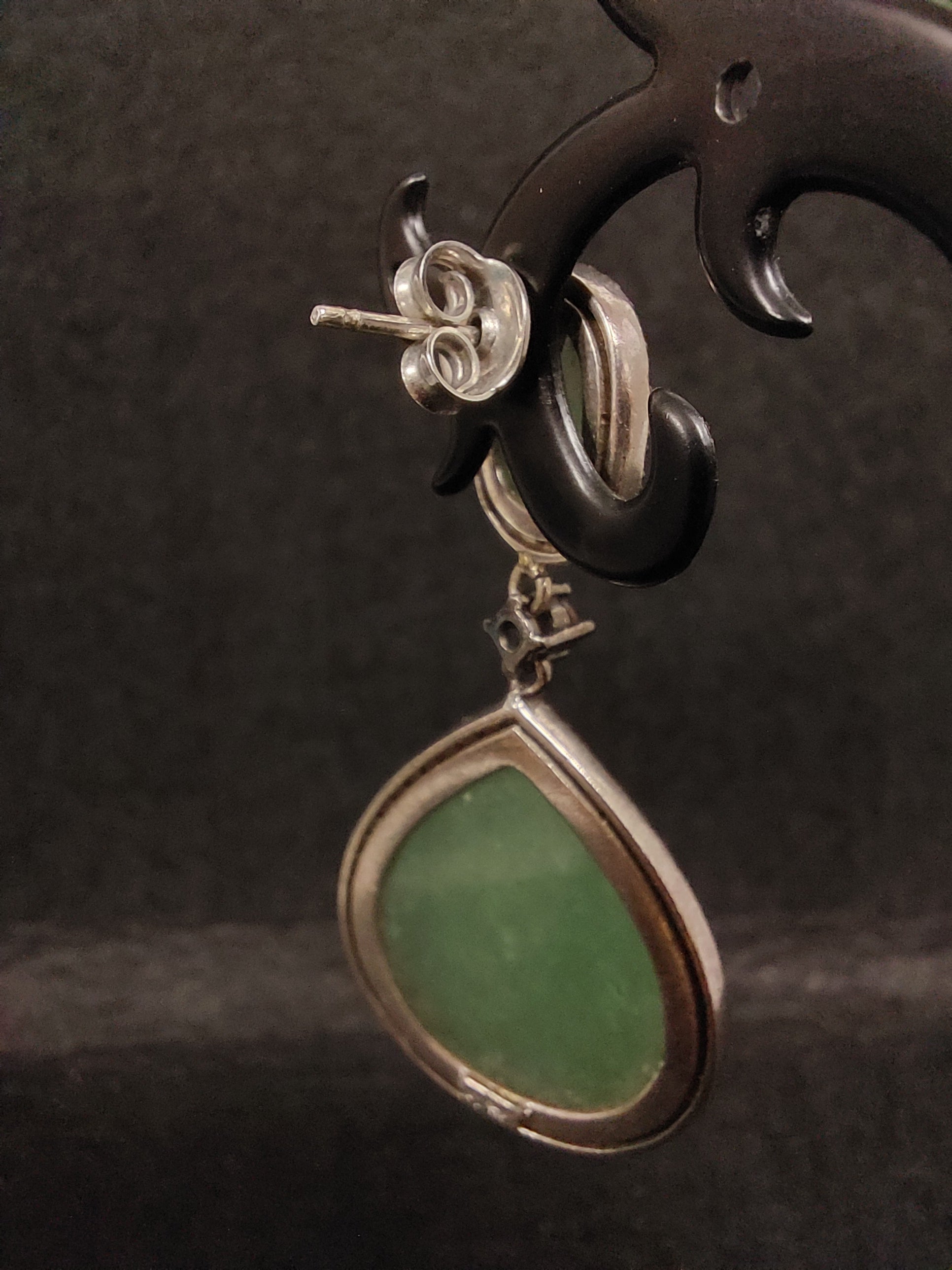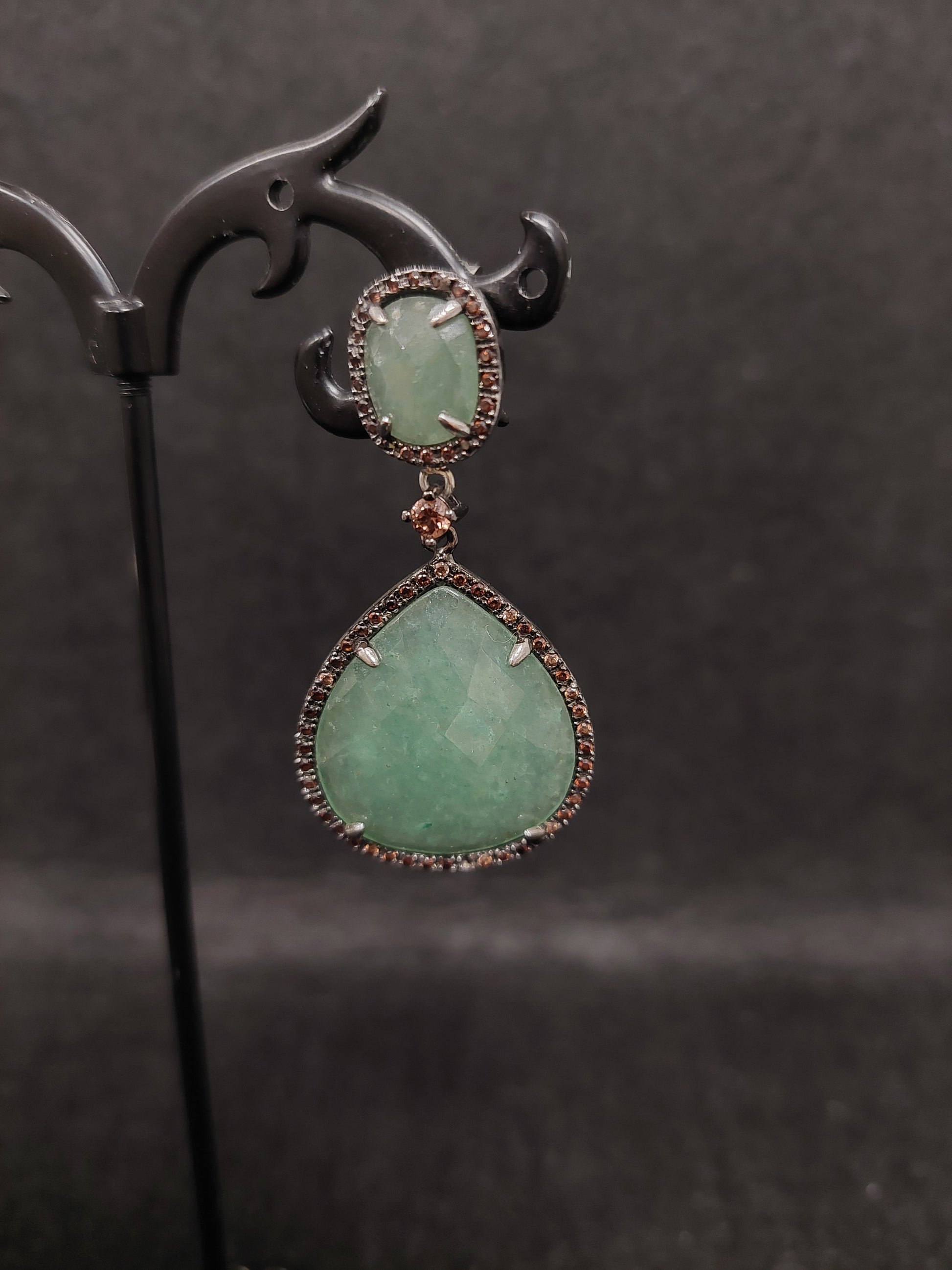 Orecchini in argento a forma di goccia, con marcassiti e pietre verdi sfaccettate; chiusura a farfalla.