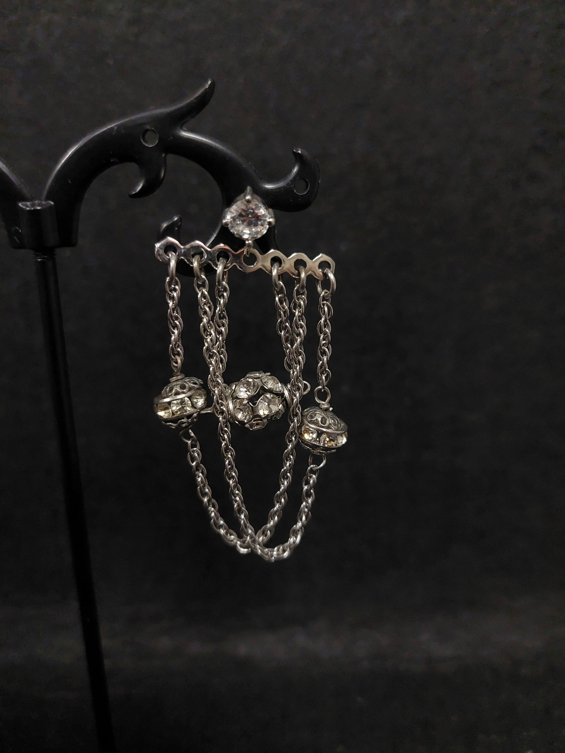 Orecchini in argento con catenine pendenti e strass; chiusura a farfalla.